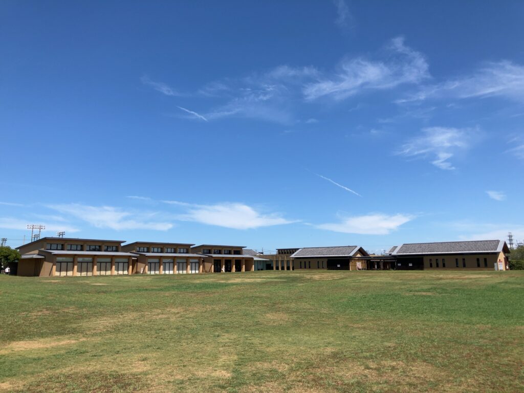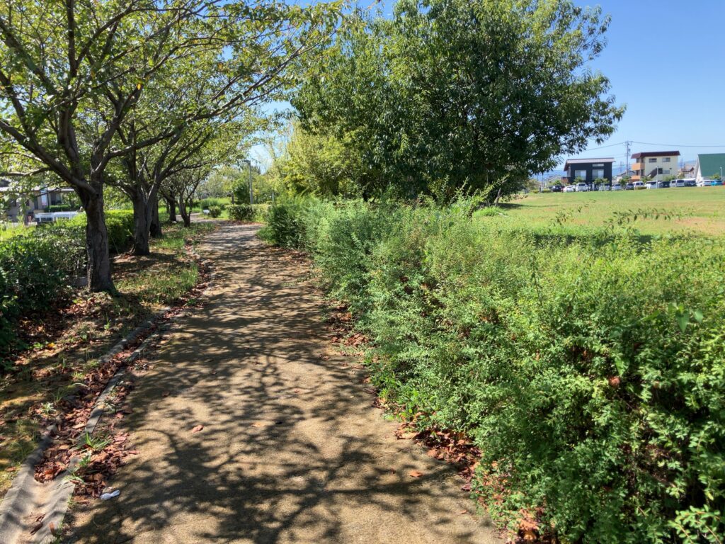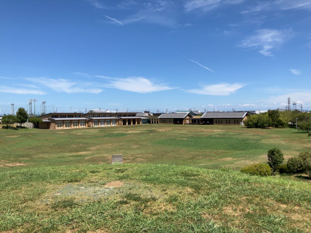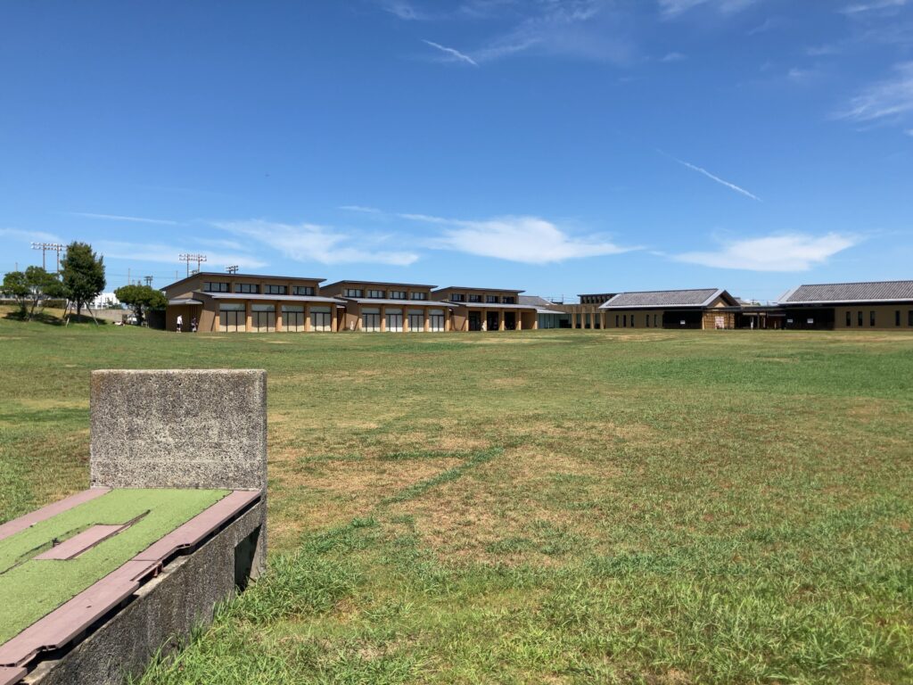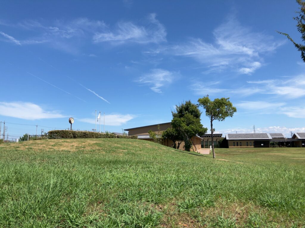ゆるやかなボウル状になった芝生広場です。芝生広場の周りには遊歩道や山もあります。