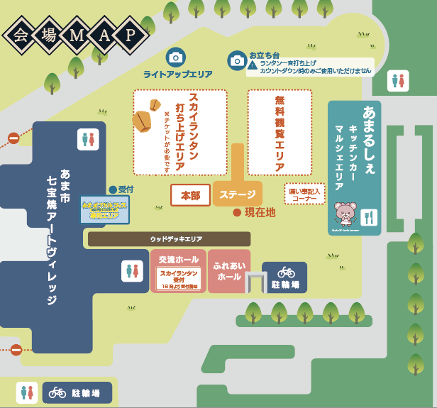 - 当日会場内では『あまポプカルフェス』『あま市スカイランタンフェス』スタッフが撮影をしております。近くで被写体を特定して撮影させていただく際にはお声がけいたしますのでご協力いただけましたら幸いです。撮影した写真についてはホームページやSNS、今後開催の広報物などでの使用の可能性もありますので予めご了承ください。