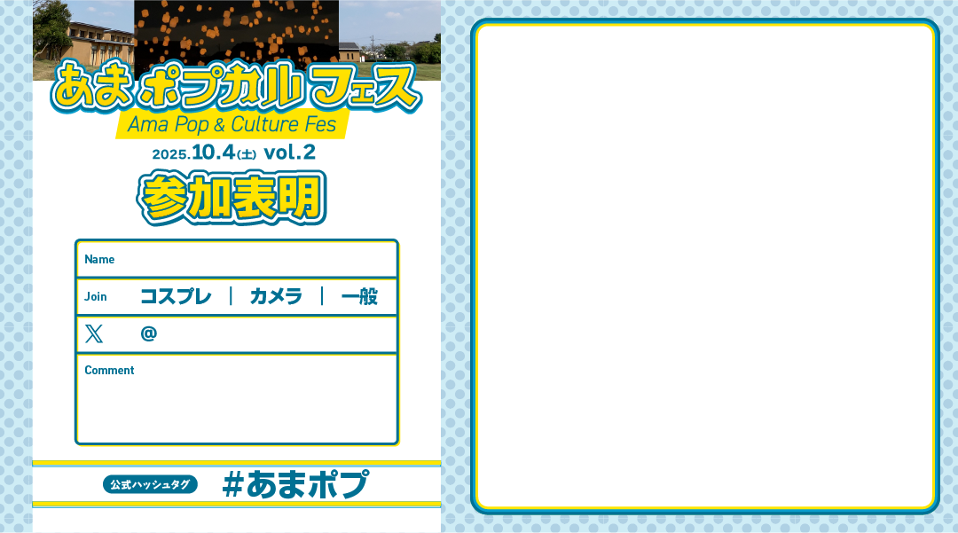 - 当日会場内では『あまポプカルフェス』『あま市スカイランタンフェス』スタッフが撮影をしております。近くで被写体を特定して撮影させていただく際にはお声がけいたしますのでご協力いただけましたら幸いです。撮影した写真についてはホームページやSNS、今後開催の広報物などでの使用の可能性もありますので予めご了承ください。