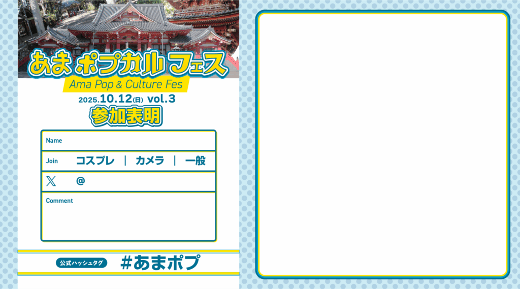 - 当日会場内では『あまポプカルフェス』『甚目寺秋まつり』スタッフが撮影をしております。近くで被写体を特定して撮影させていただく際にはお声がけいたしますのでご協力いただけましたら幸いです。撮影した写真についてはホームページやSNS、今後開催の広報物などでの使用の可能性もありますので予めご了承ください。