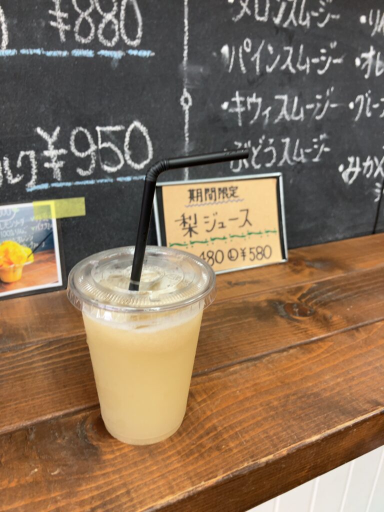 地元の昔からある果物屋さんですが、店内に入ると注文した商品を置いて写真を撮りたくなるスポットや座ってくつろげるベンチなどもあり店内飲食も楽しめます。